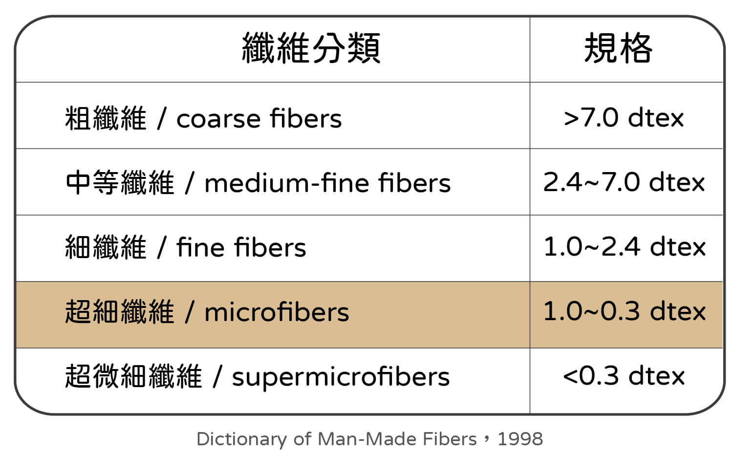 Microfiber正確的中文名稱應該稱為超細纖維,並非是極超細纖維,而市面上有許多廠商會以極超細纖維來做命名,無非是為了達到更好的銷售效果。其實纖維的粗細在紡織產業綜合研究所有嚴格的分類,見以下表 :