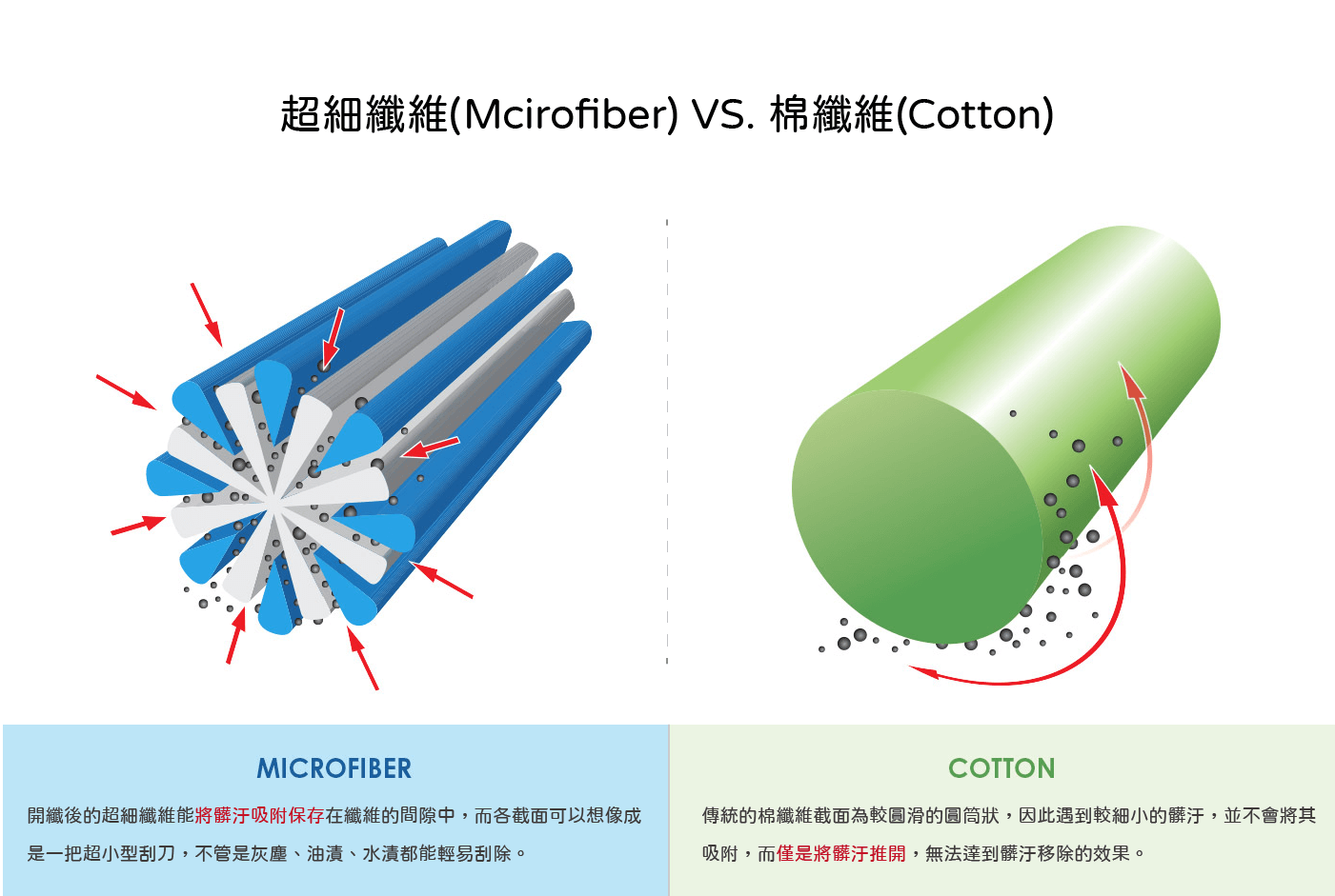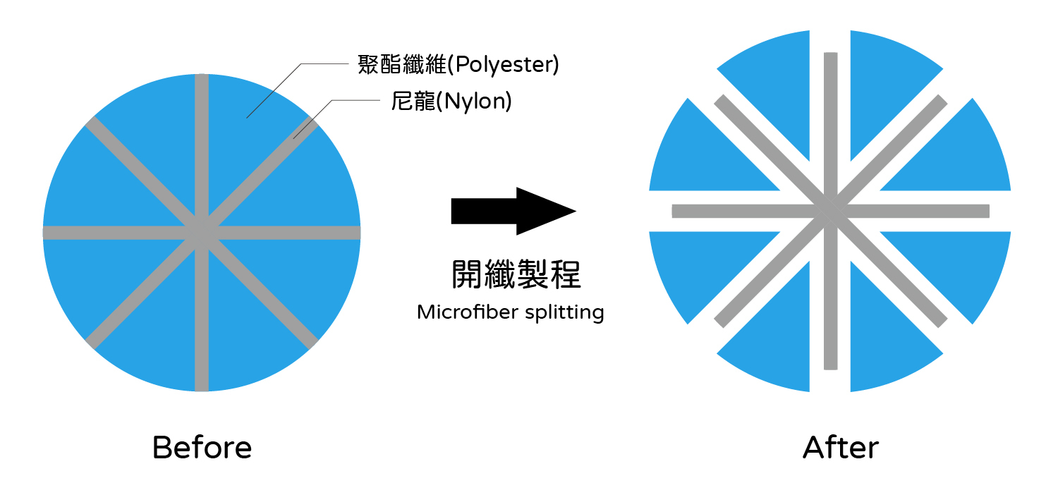 超細纖維由80%聚酯纖維20%尼龍(最佳比例)做合成,再經過繁瑣的製程將單根纖維會分裂成12切面,其纖維細度約為棉纖維的十分之一,頭髮的兩百五十分之一。而開纖後產生的切面及凹槽就是清潔力與吸水力勝過100%棉的關鍵。