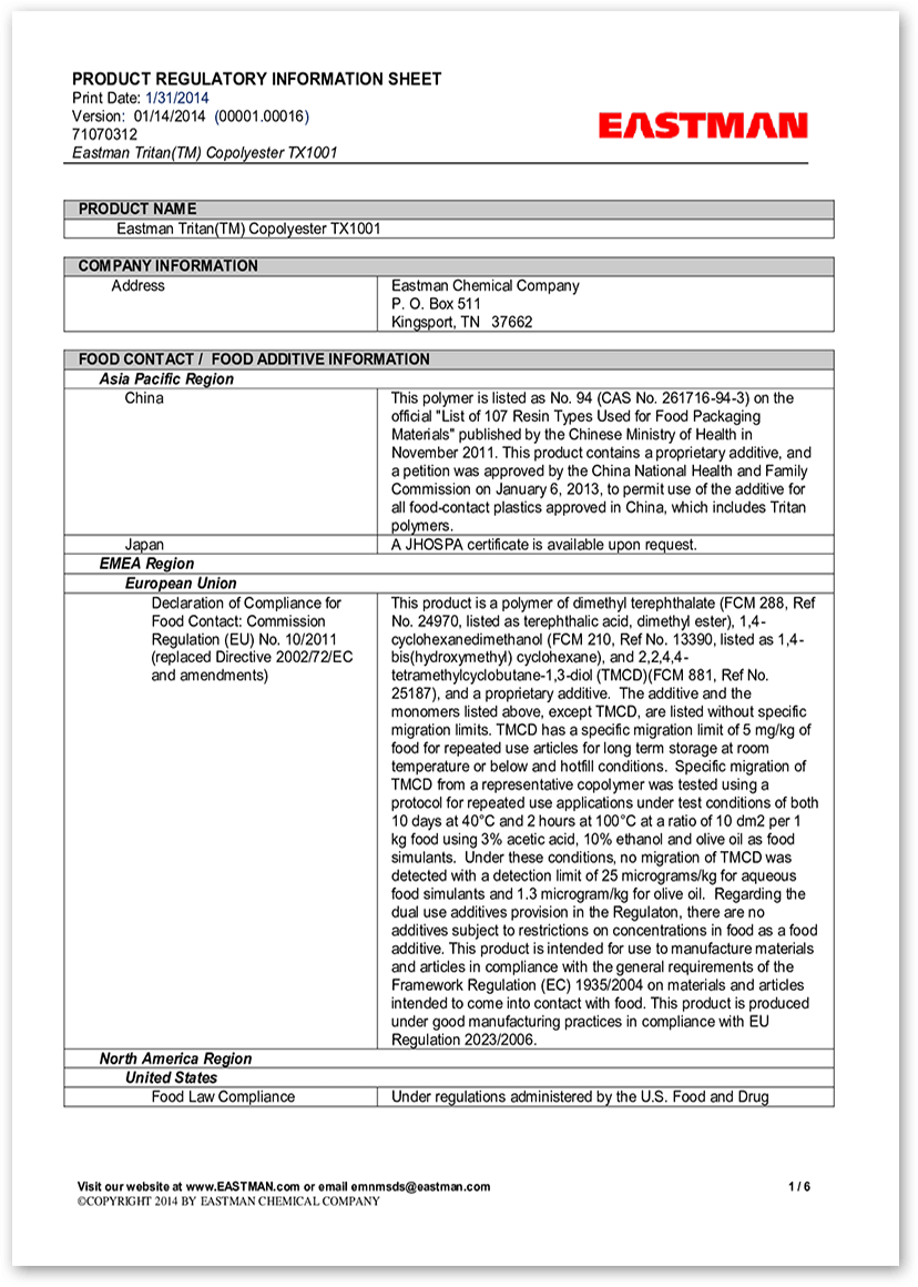 Tritan™共聚聚酯是一種堅韌、不含雙酚A (BPA) 的塑料,用於製造您日常使用的各種產品。採用Tritan製作的產品具有抗衝擊和不易碎裂的特性。